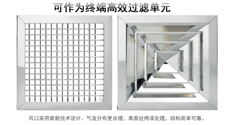 風(fēng)口采用最新技術(shù)設(shè)計(jì)、使氣流分布更合理,箱體采用優(yōu)質(zhì)不銹鋼板或冷軋鋼板制作,表面經(jīng)烤漆處理,結(jié)構(gòu)簡(jiǎn)單可靠,其中高效送風(fēng)口可作為終端高效過濾單元直接置干各個(gè)級(jí)別的潔凈率吊頂?shù)取?/p>